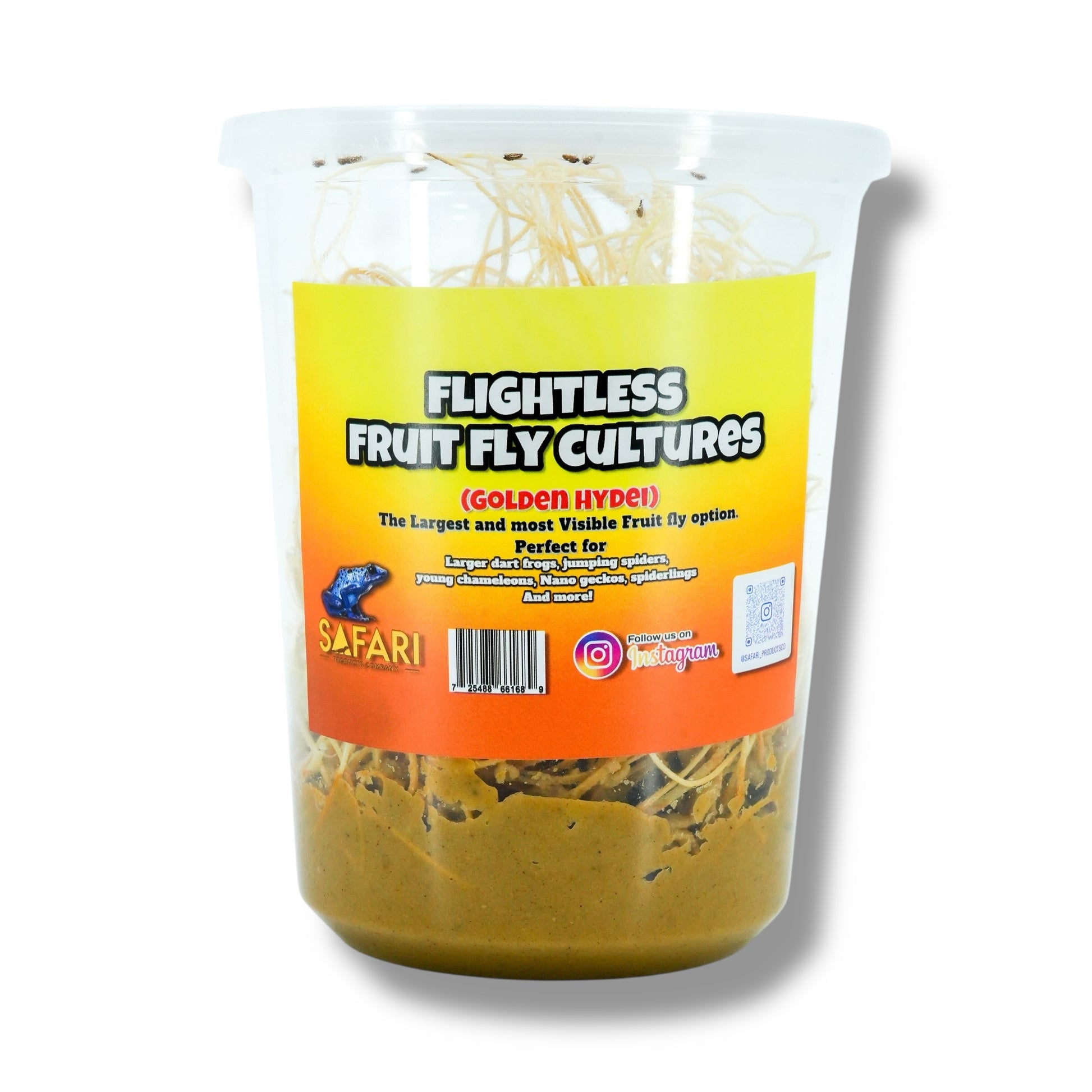 Golden Hydei Fruit Fly Cultures offer the largest fruit flies available, measuring 1/8" in length. Their bright coloration makes them highly visible against dark soils, facilitating easier hunting for species with less precise targeting abilities. These cultures are ideal for feeding larger insectivores such as dart frogs, spiderlings, small jumping spiders, and juvenile chameleons, providing a nutritious and appropriately sized live food source.